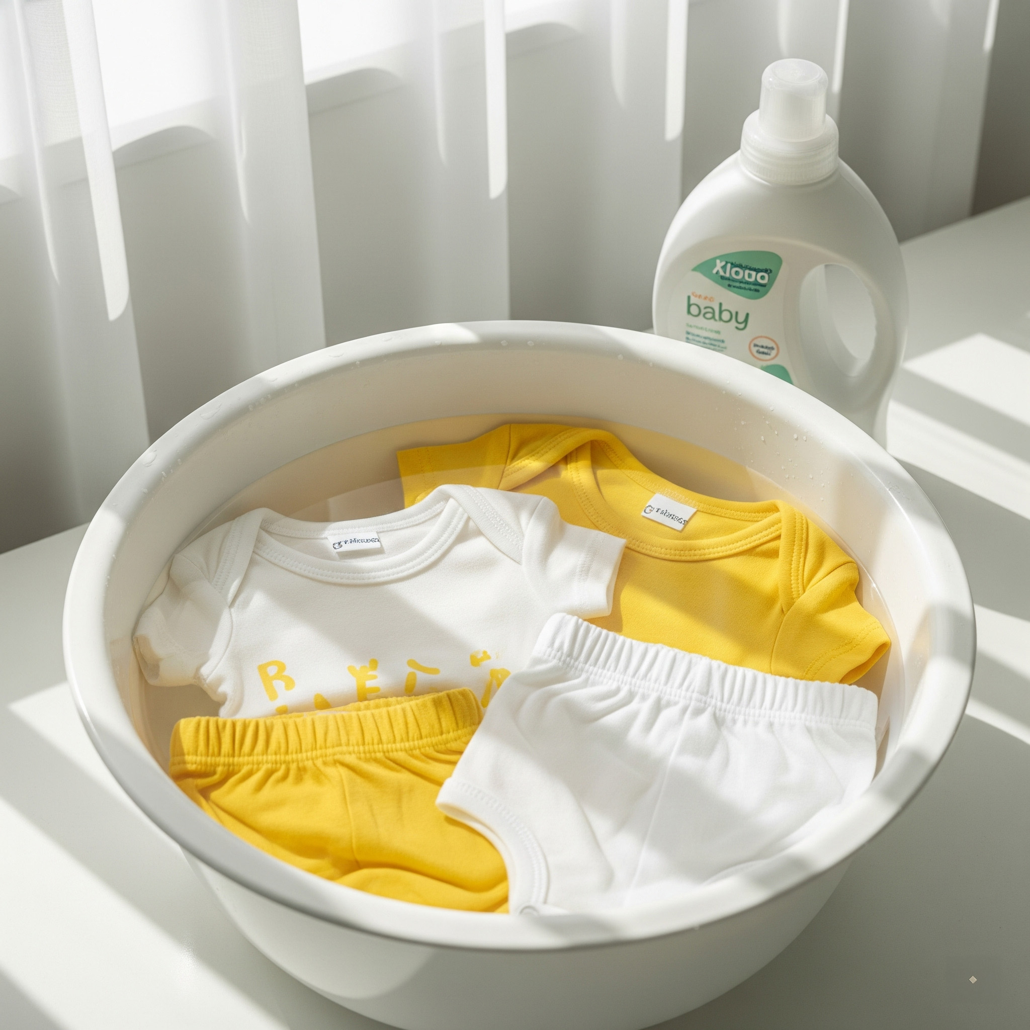 Hệ miễn dịch của bé còn yếu nên rất dễ kích ứng với hóa chất mạnh. Mẹ chỉ nên dùng xà phòng dịu nhẹ, nước giặt dành riêng cho trẻ em, và tránh dùng nước xả vải có mùi quá nồng. Nếu có điều kiện, hãy giặt tay những món đồ bé mặc trực tiếp cả ngày.