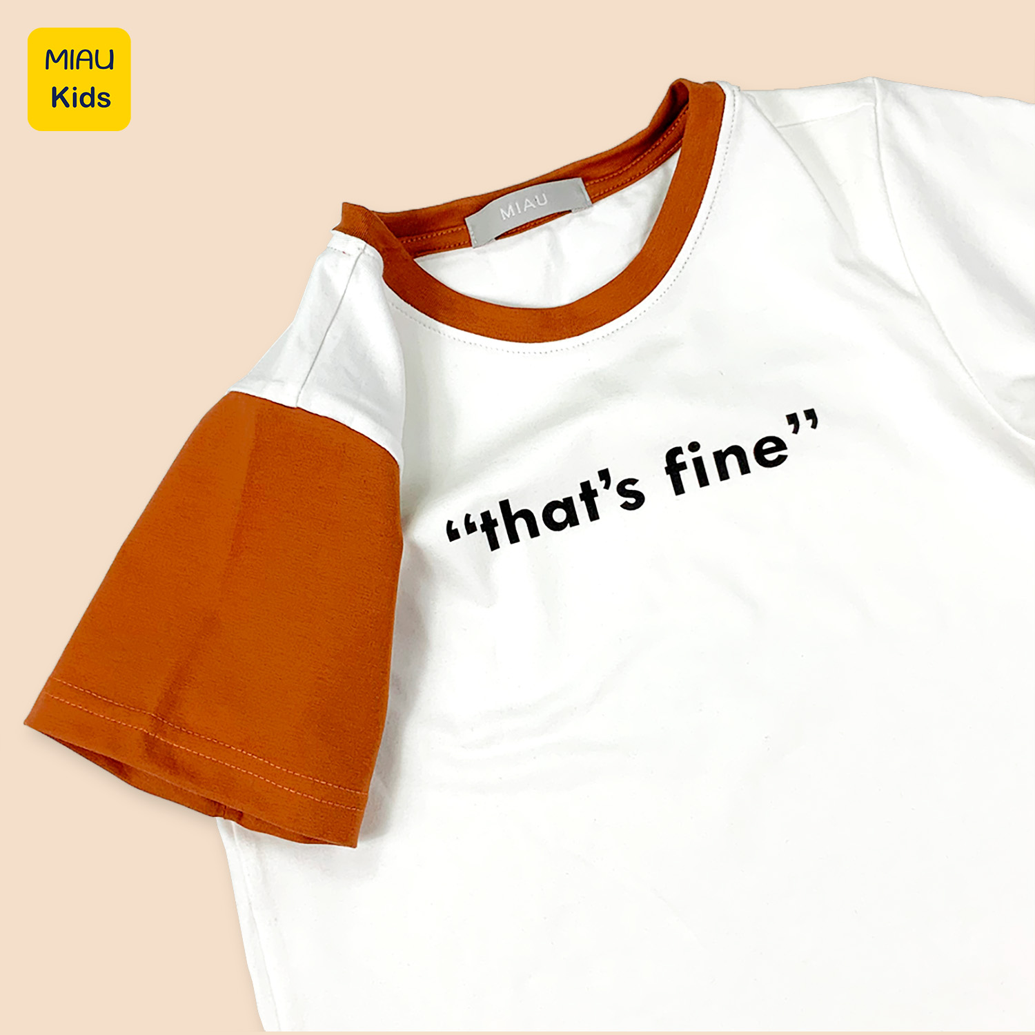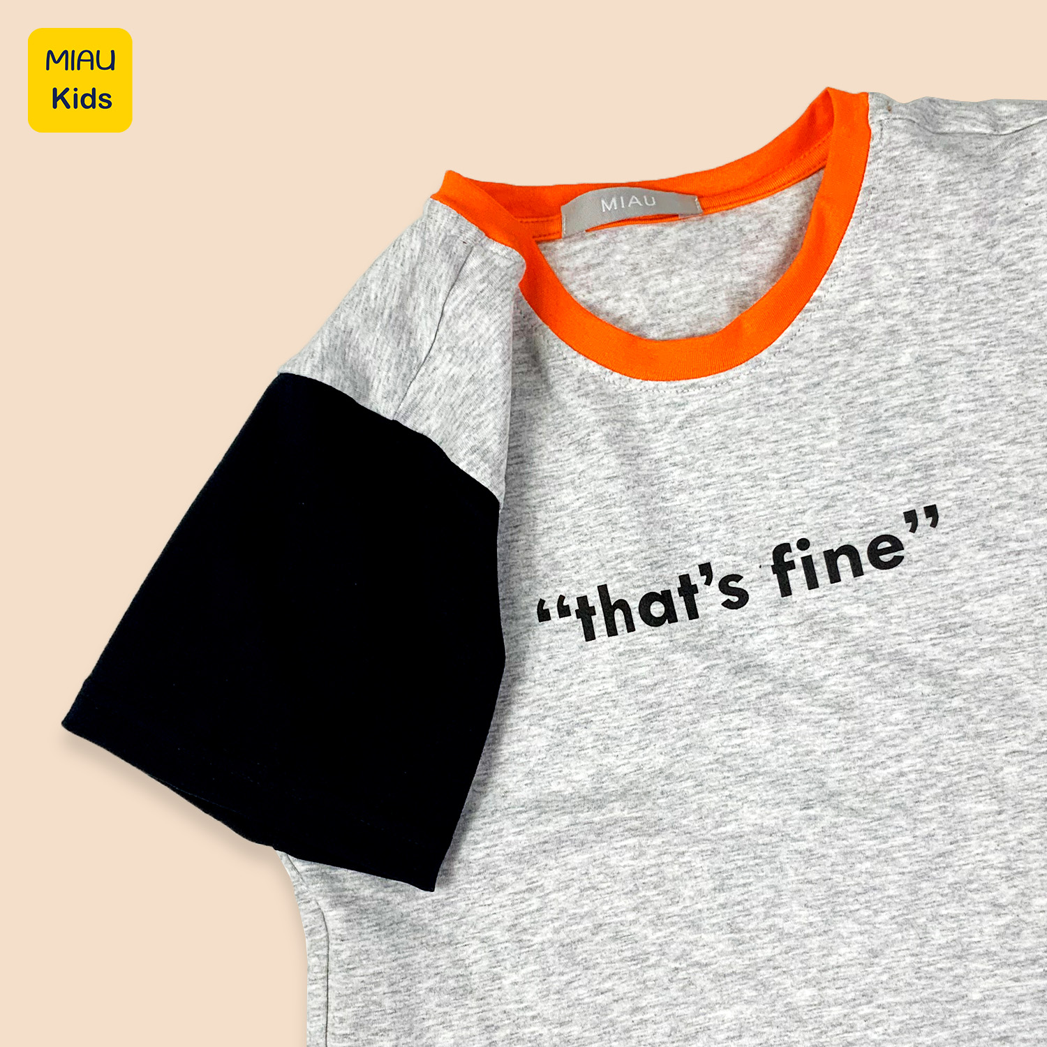 Áo thun bé trai MiauKids với thiết kế phối tay bất đối xứng đầy sáng tạo, kết hợp dòng chữ "That's Fine" thể hiện tinh thần tự tin, năng động của các chàng trai nhí. Có 2 phiên bản màu sắc: