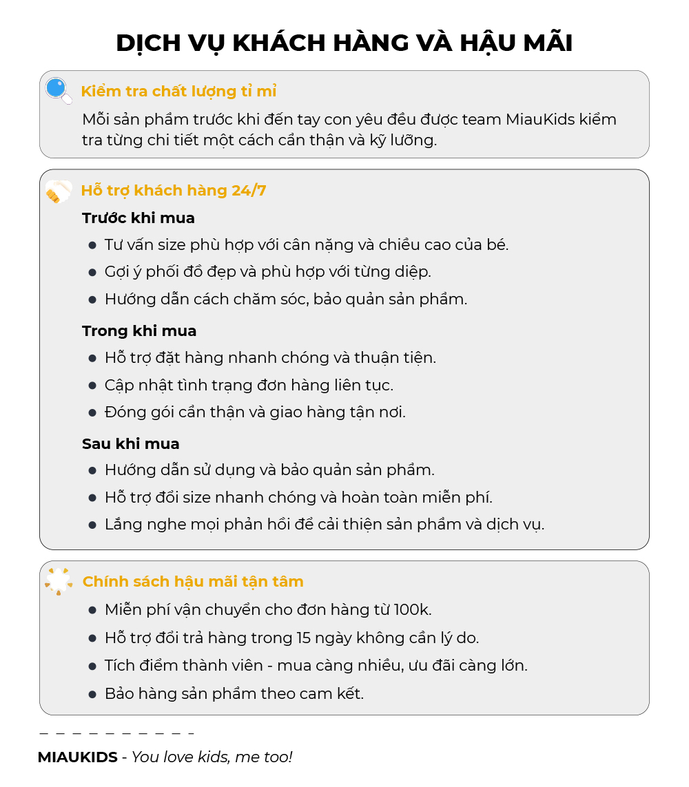 MiauKids hiểu rằng đôi khi ba mẹ chọn đồ cho bé nhưng có thể chưa vừa ý hoặc size chưa thật chuẩn. Vì vậy, để đảm bảo bé yêu luôn có được những bộ đồ xinh xắn và thoải mái nhất, MiauKids xin gửi đến ba mẹ chính sách đổi trả hàng vô cùng đơn giản và tận tình sau đây.
