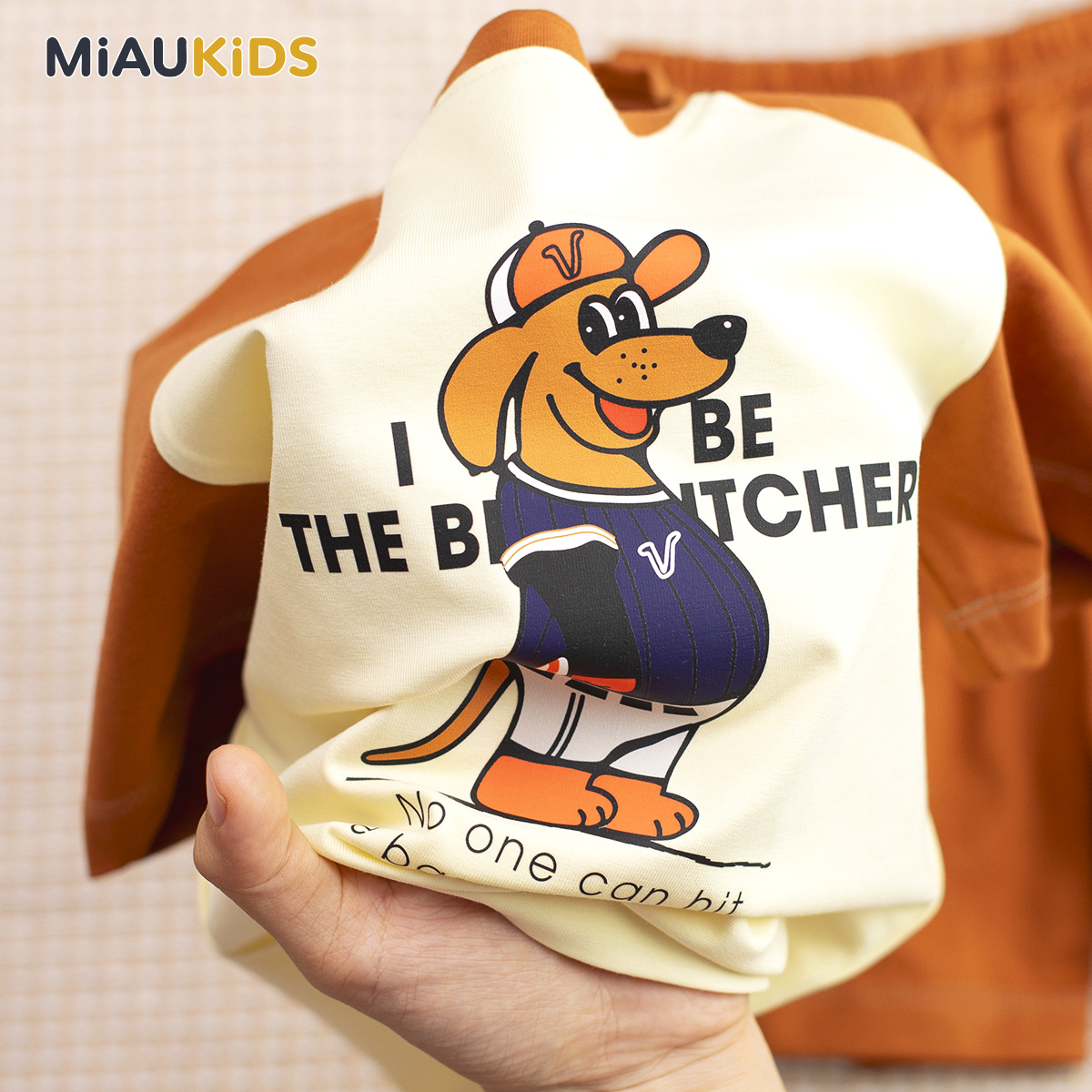 Bộ quần áo trẻ em MiauKids mang đến cho con yêu phong cách năng động với thiết kế casual hiện đại. Hoạ tiết chú chó đáng yêu đội mũ bóng chày, mặc đồng phục thể thao kèm dòng chữ "I BE THE BATCHER - No one can hit the baseball I threw!" thể hiện tinh thần thể thao mạnh mẽ, giúp bé tự tin thể hiện cá tính riêng.